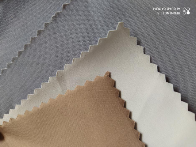 第一款是滌綸消光高彈面料(CPT224005),100%滌綸,成本相對(duì)氨綸包覆絲低,全滌染色色牢度較好。染色成品以后,手感挺闊爽滑,具有彈力。經(jīng)后整理方式處理后,透濕性好,具有防水功能。